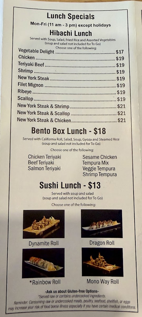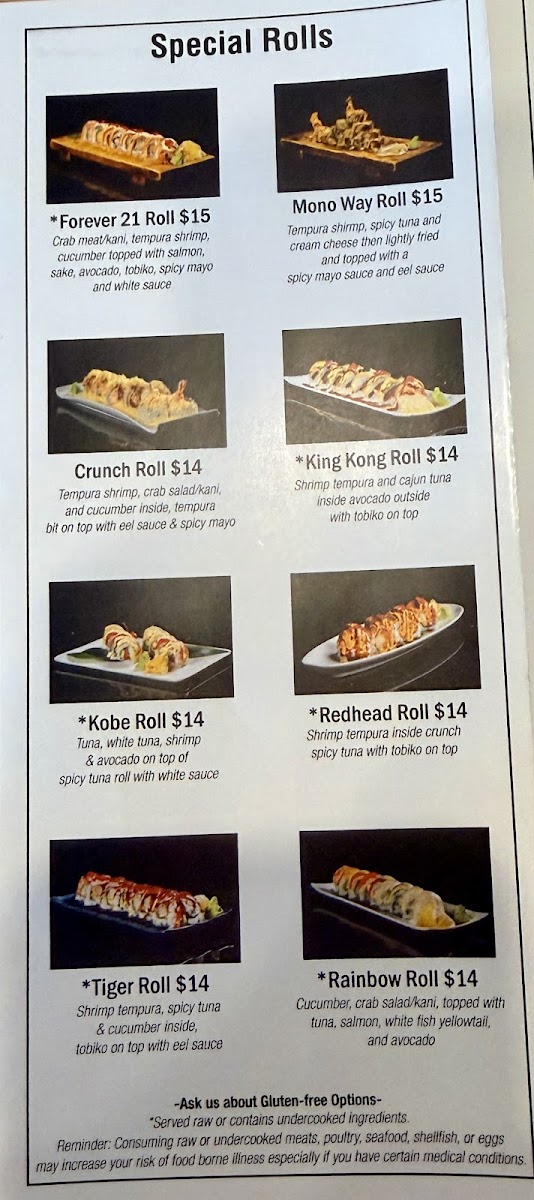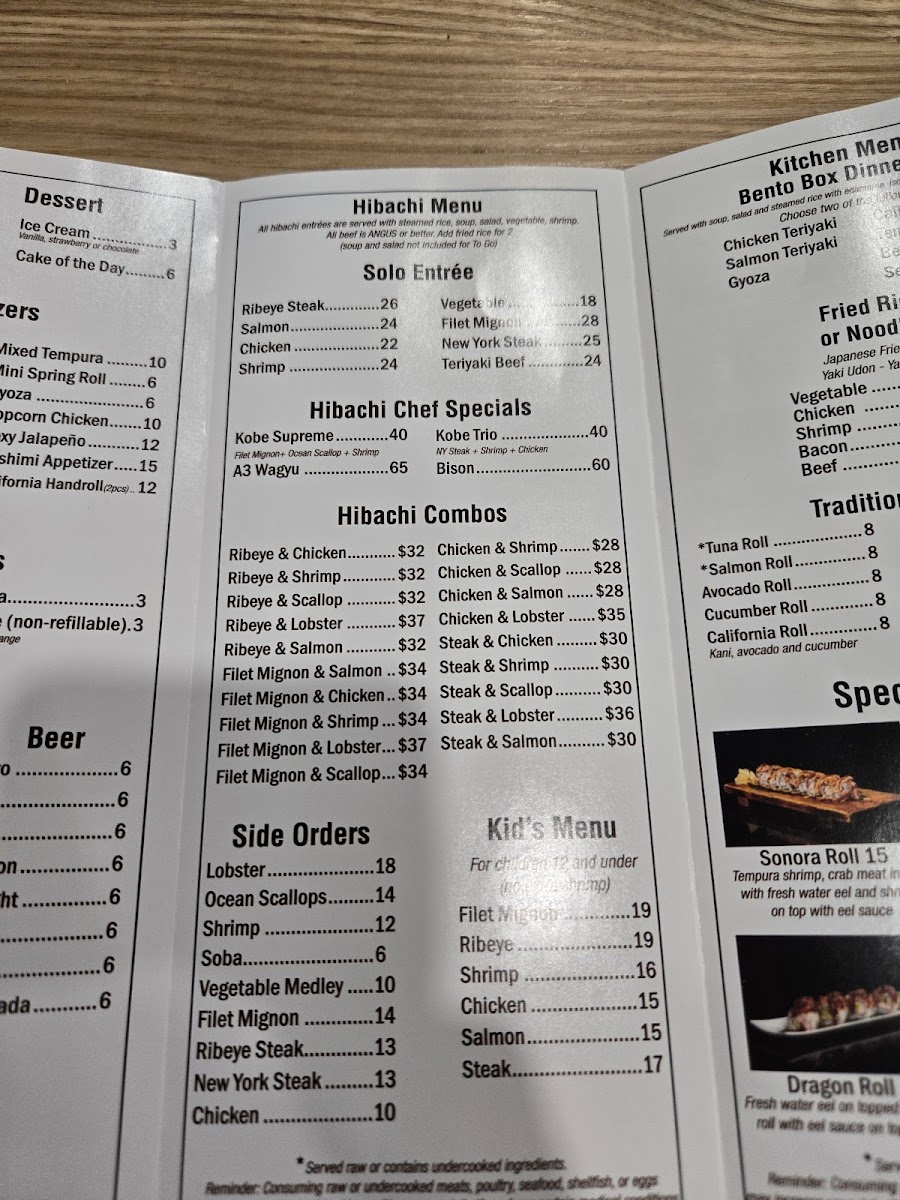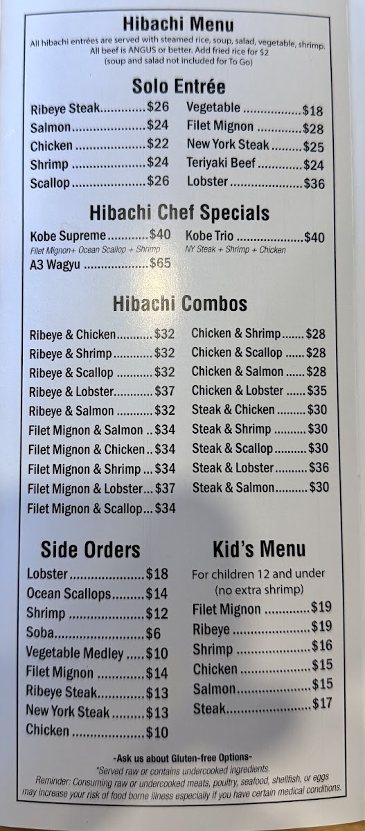 From a reviewer’s perspective, the menu at Kobe Japanese Steakhouse offers a wide and satisfying variety, ranging from classic hibachi combinations to sushi rolls and comforting noodle dishes, making it easy for guests to find something they enjoy. The fried rice options such as Shrimp Fried Rice Plate and Bacon Fried Rice Plate are flavorful staples, while the hibachi combinations like Ck & Sal, FM & Ck, Ck & Lob, and Stk & Sh provide generous portions and entertaining grill-side preparation. Premium selections from the chef specials, including Kobe Trio, Kobe Supreme, A3 Wyu, and A3 Wyu & Lob, stand out as more luxurious choices for diners looking for something special. Sushi lovers can enjoy rolls such as Crunch Roll, Mono Way Roll, Dynamite Roll, Rainbow Roll, and Dragon Roll, along with traditional options like Spicy Tuna Roll and Shrimp Tempura Roll. The menu also features hearty entrées like New York Steak, Chicken, Shrimp, and Ribeye Steak, plus noodle dishes such as House Noodle, Bacon Noodle, and Shrimp Noodle. Appetizers like Sashimi, Vegetable Tempura, and Gyoza pair well with beverages including Large Asahi Dry and Hot Sake Large, and desserts like Mochi or Ice Cream provide a sweet finish. Overall, the menu is diverse, clearly structured, and appealing, offering a balanced mix of hibachi, sushi, and traditional Japanese-inspired dishes suitable for both casual lunches and more indulgent dinners.