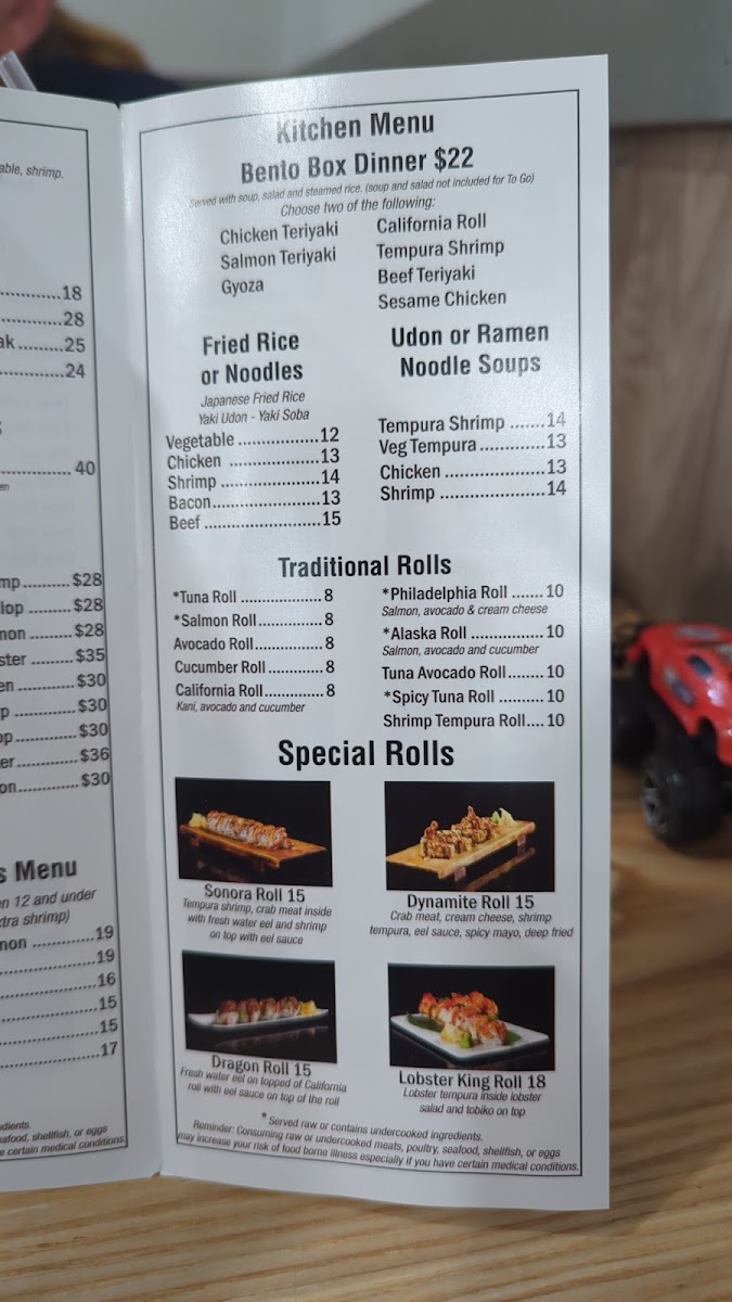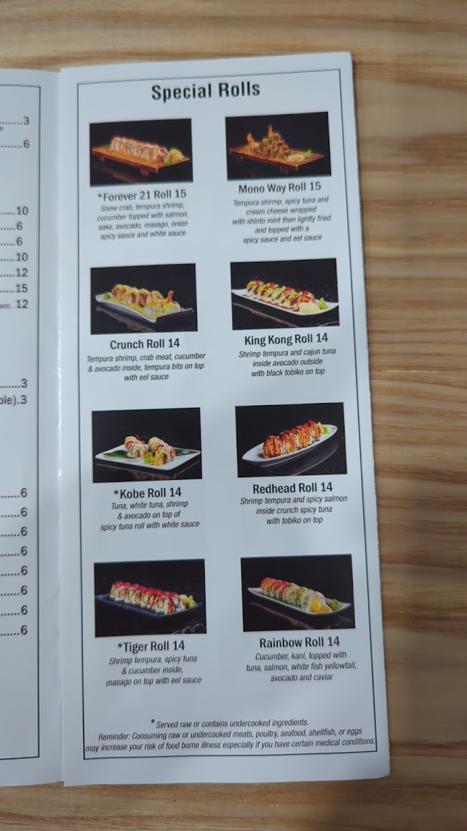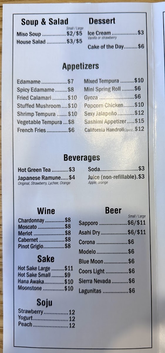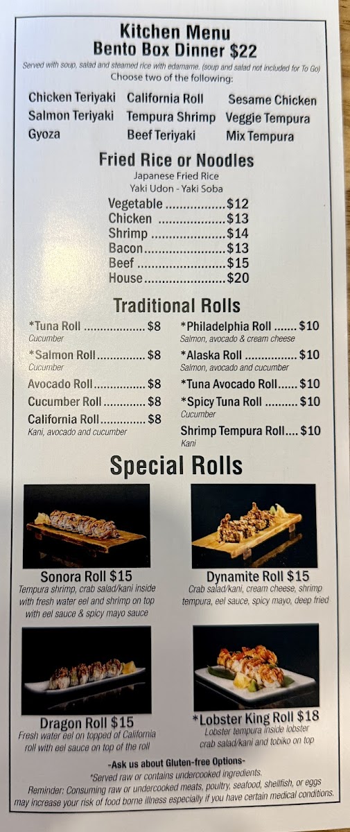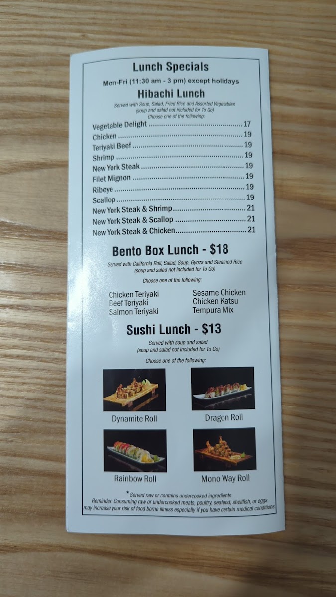 From a reviewer’s perspective, the menu at Kobe Japanese Steakhouse offers a wide and satisfying variety, ranging from classic hibachi combinations to sushi rolls and comforting noodle dishes, making it easy for guests to find something they enjoy. The fried rice options such as Shrimp Fried Rice Plate and Bacon Fried Rice Plate are flavorful staples, while the hibachi combinations like Ck & Sal, FM & Ck, Ck & Lob, and Stk & Sh provide generous portions and entertaining grill-side preparation. Premium selections from the chef specials, including Kobe Trio, Kobe Supreme, A3 Wyu, and A3 Wyu & Lob, stand out as more luxurious choices for diners looking for something special. Sushi lovers can enjoy rolls such as Crunch Roll, Mono Way Roll, Dynamite Roll, Rainbow Roll, and Dragon Roll, along with traditional options like Spicy Tuna Roll and Shrimp Tempura Roll. The menu also features hearty entrées like New York Steak, Chicken, Shrimp, and Ribeye Steak, plus noodle dishes such as House Noodle, Bacon Noodle, and Shrimp Noodle. Appetizers like Sashimi, Vegetable Tempura, and Gyoza pair well with beverages including Large Asahi Dry and Hot Sake Large, and desserts like Mochi or Ice Cream provide a sweet finish. Overall, the menu is diverse, clearly structured, and appealing, offering a balanced mix of hibachi, sushi, and traditional Japanese-inspired dishes suitable for both casual lunches and more indulgent dinners.